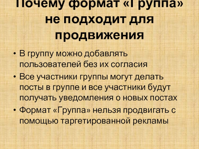 Слайд 4Почему формат «Группа» не подходит для продвижения