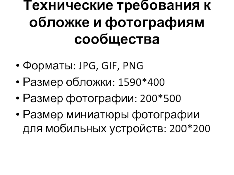 Слайд 49Технические требования к обложке и фотографиям сообщества