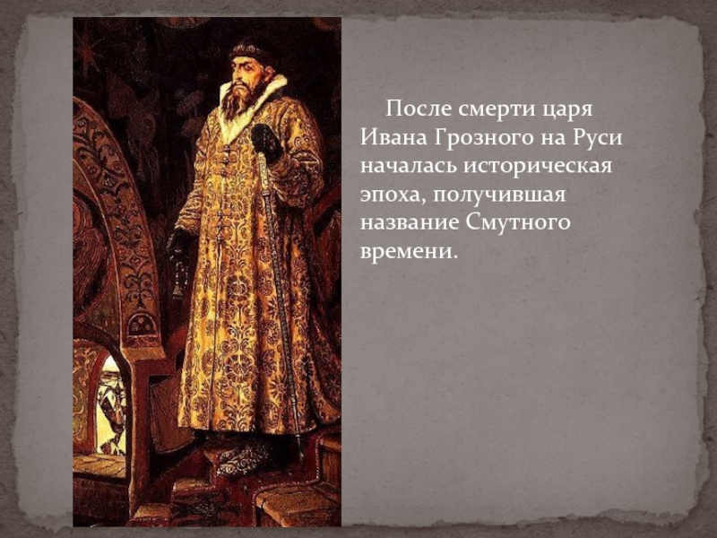 Слайд 2После смерти царя Ивана Грозного на Руси началась историческая эпоха, получившая