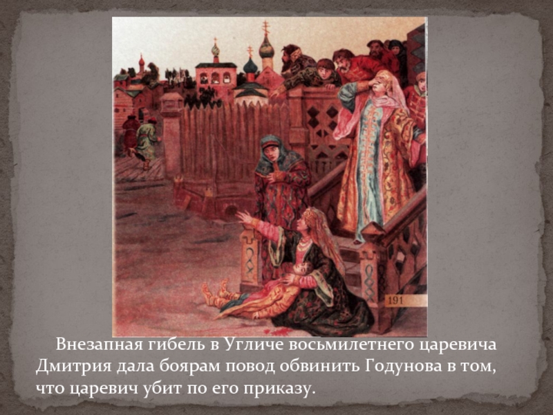 Слайд 7Внезапная гибель в Угличе восьмилетнего царевича Дмитрия дала боярам повод обвинить