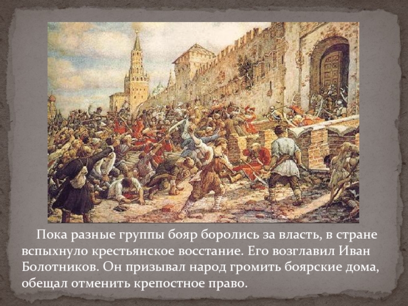 Слайд 12Пока разные группы бояр боролись за власть, в стране вспыхнуло крестьянское