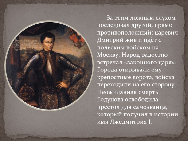 и идёт с польским войском на Москву. Народ радостно встречал «законного царя». Города открывали ему крепостные ворота, войска переходили на его сторону. Неожиданная смерть Годунова освободила престол для самозванца, который получил в истории имя Лжедмитрия I.