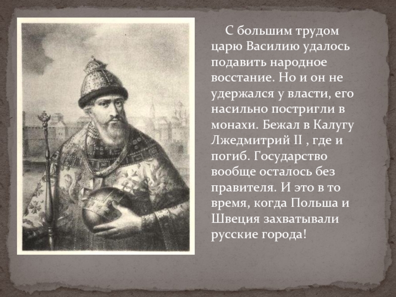 он не удержался у власти, его насильно постригли в монахи. Бежал в Калугу Лжедмитрий II , где и погиб. Государство вообще осталось без правителя. И это в то время, когда Польша и Швеция захватывали русские города!