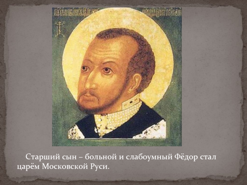 Слайд 4Старший сын – больной и слабоумный Фёдор стал царём Московской Руси.