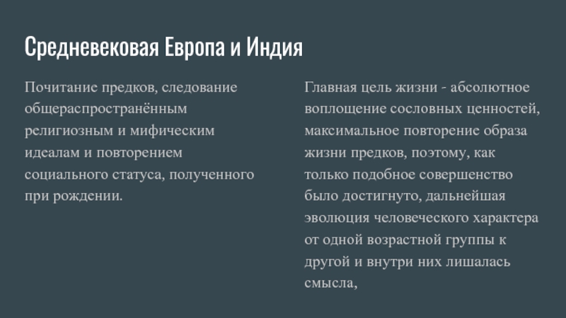 Главная цель жизни - абсолютное воплощение сословных ценностей, максимальное повторение образа жизни предков, поэтому, как только подобное совершенство было достигнуто, дальнейшая эволюция человеческого характера от одной возрастной группы к другой и внутри них лишалась смысла,