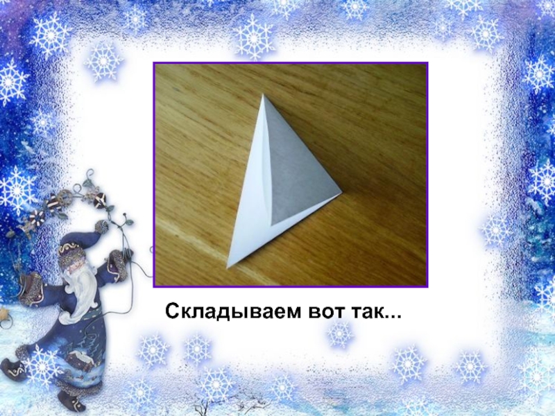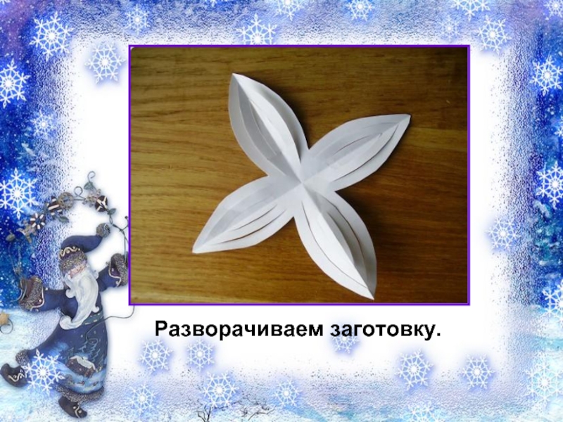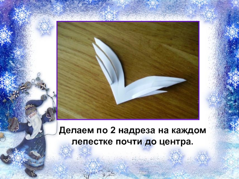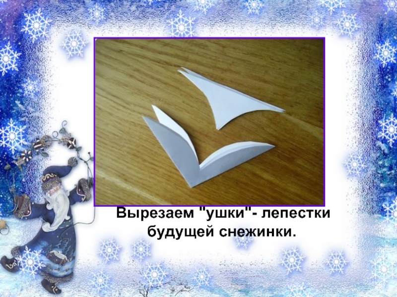 Слайд 4 Вырезаем "ушки"- лепестки будущей снежинки.