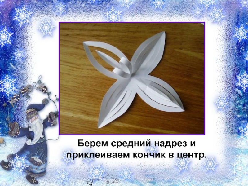 Слайд 7Берем средний надрез и приклеиваем кончик в центр.