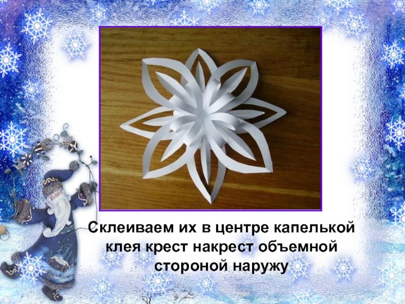 Слайд 9Склеиваем их в центре капелькой клея крест накрест объемной стороной наружу