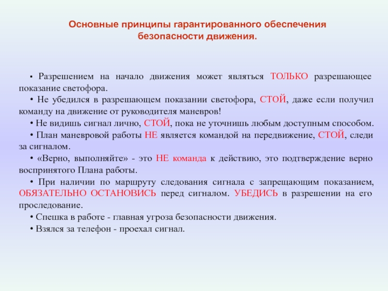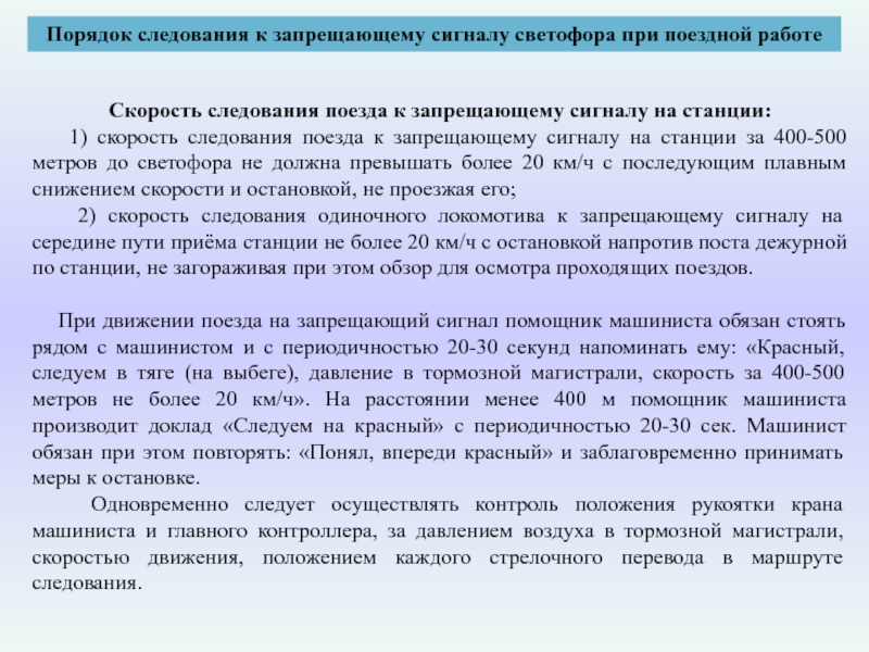 Машинист локомотива, после получения команды по радиостанции от ДСП (составителя поездов, поездного диспетчера – на участках с диспетчерской централизацией) на отправление поезда (начало маневровых передвижений локомотивом вперед), обязан лично убедиться в показании светофора и при повторении по радиостанции полученной информации, перед приведением локомотива в движение, продублировать словами: «Вижу выходной (маршрутный, выходной, маневровый и т.д.) зеленый (белый, желтый, два желтых и т.д.)».