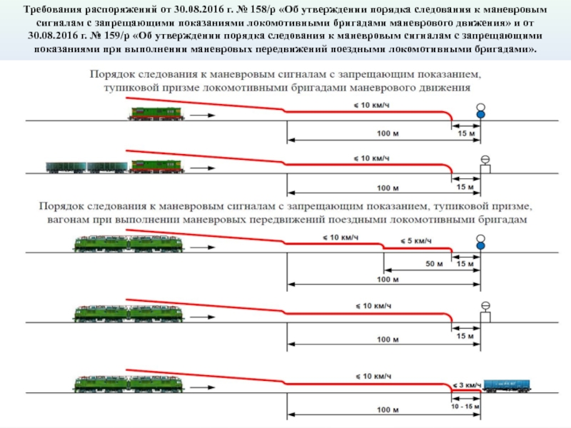 В случаях остановки грузового поезда, длина которого менее вместимости пути, оборудованного сбрасывающим башмаком, остряком или сбрасывающей стрелкой, не доезжая до выходного светофора (при отсутствии до предельного столбика), во всех случаях машинист производит доклад дежурной по станции об остановке с удержанием поезда на тормозах, и только после согласования своих действий с дежурной по станции отпускать автотормоза и производить подтягивание состава к светофору (при отсутствии к предельному столбику).