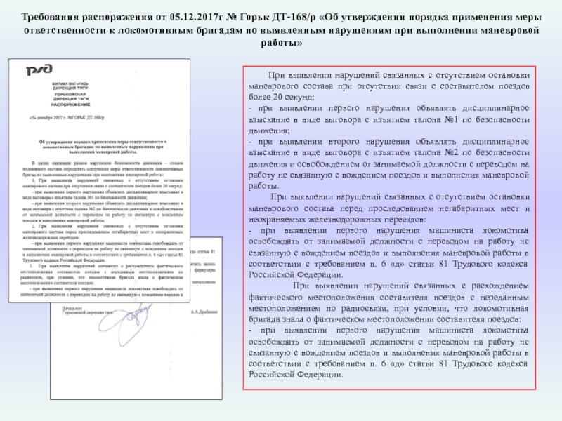 - при выявлении второго нарушения объявлять дисциплинарное взыскание в виде выговора с изъятием талона №2 по безопасности движения и освобождением от занимаемой должности с переводом на работу не связанную с вождением поездов и выполнения маневровой работы.