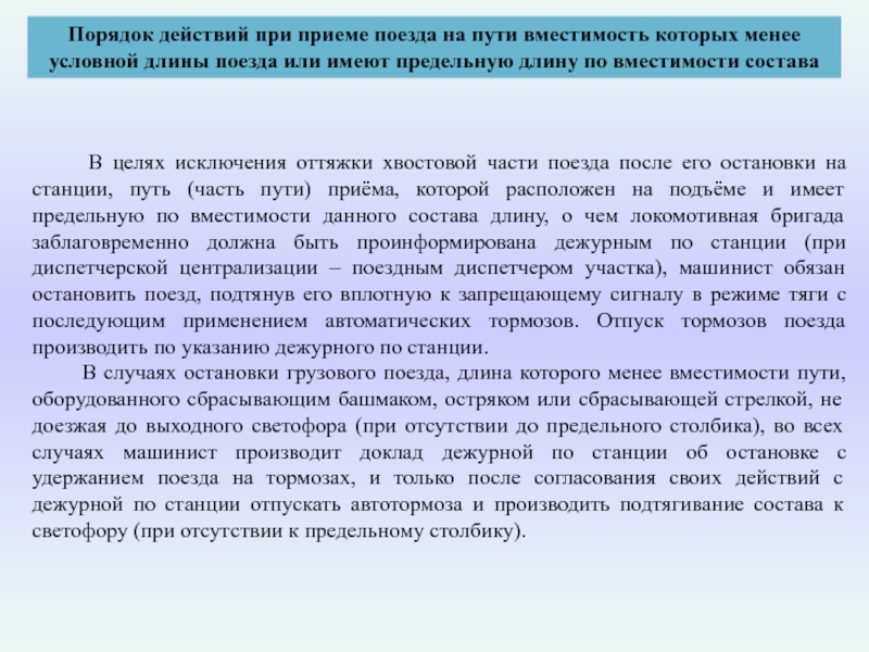 В целях исключения оттяжки хвостовой части поезда после его остановки на станции, путь (часть пути) приёма, которой расположен на подъёме и имеет предельную по вместимости данного состава длину, о чем локомотивная бригада заблаговременно должна быть проинформирована дежурным по станции (при диспетчерской централизации – поездным диспетчером участка), машинист обязан остановить поезд, подтянув его вплотную к запрещающему сигналу в режиме тяги с последующим применением автоматических тормозов. Отпуск тормозов поезда производить по указанию дежурного по станции.