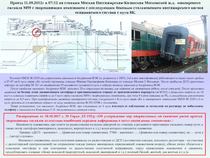 Тепловоз ЧМЭ3 № 2529 под управлением машиниста Андрюхина М.М. (в должности с 2007г, 3-й класс квалификации) работающего в «одно лицо» прибыл в 07-07 на 6 путь парка «К» четной горловины станции Москва Пассажирская-Казанская со станции Москва 2 Митьково. После прибытия ДСП приготовил маршрут за светофор М 101 по направлению 42 вытяжного тупикового пути и передал команду машинисту Андрюхину М.М.