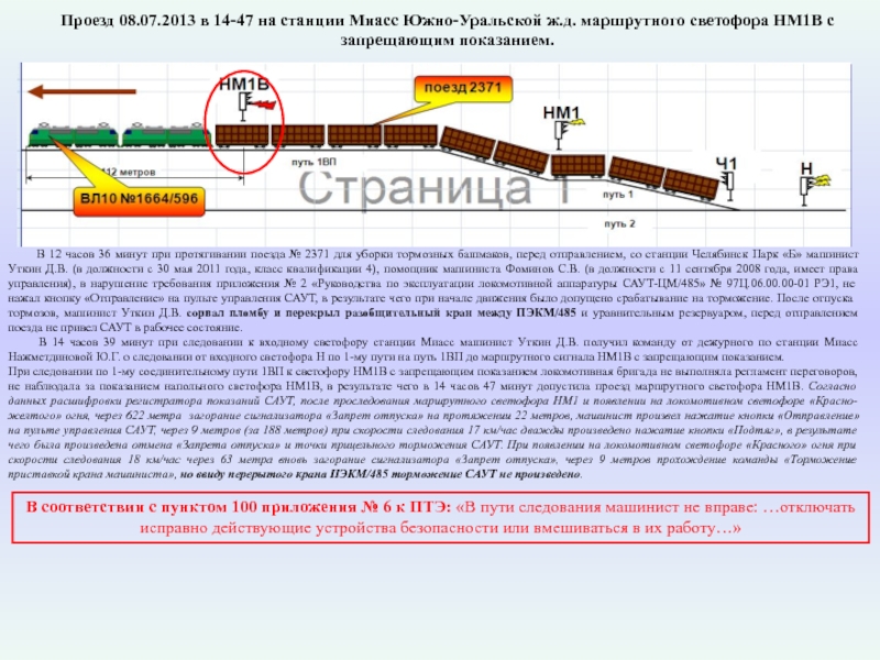 В 12 часов 36 минут при протягивании поезда № 2371 для уборки тормозных башмаков, перед отправлением, со станции Челябинск Парк «Б» машинист Уткин Д.В. (в должности с 30 мая 2011 года, класс квалификации 4), помощник машиниста Фоминов С.В. (в должности с 11 сентября 2008 года, имеет права управления), в нарушение требования приложения № 2 «Руководства по эксплуатации локомотивной аппаратуры САУТ-ЦМ/485» № 97Ц.06.00.00-01 РЭ1, не нажал кнопку «Отправление» на пульте управления САУТ, в результате чего при начале движения было допущено срабатывание на торможение. После отпуска тормозов, машинист Уткин Д.В. сорвал пломбу и перекрыл разобщительный кран между ПЭКМ/485 и уравнительным резервуаром, перед отправлением поезда не привел САУТ в рабочее состояние.