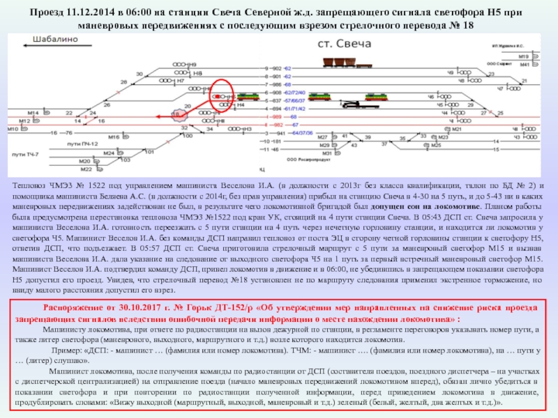 Тепловоз ЧМЭ3 № 1522 под управлением машиниста Веселова И.А. (в должности с 2013г без класса квалификации, талон по БД № 2) и помощника машиниста Беляева А.С. (в должности с 2014г, без прав управления) прибыл на станцию Свеча в 4-30 на 5 путь, и до 5-43 ни в каких маневровых передвижениях задействован не был, в результате чего локомотивной бригадой был допущен сон на локомотиве. Планом работы была предусмотрена перестановка тепловоза ЧМЭ3 №1522 под кран УК, стоящий на 4 пути станции Свеча. В 05:43 ДСП ст. Свеча запросила у машиниста Веселова И.А. готовность переезжать с 5 пути станции на 4 путь через нечетную горловину станции, и находится ли локомотив у светофора Ч5. Машинист Веселов И.А. без команды ДСП направил тепловоз от поста ЭЦ в сторону четной горловины станции к светофору Н5, ответив ДСП, что подъезжает. В 05:57 ДСП ст. Свеча приготовила стрелочный маршрут с 5 пути за маневровый светофор М15 и вызвав машиниста Веселова И.А. дала указание на следование от выходного светофора Ч5 на 1 путь за первый встречный маневровый светофор М15. Машинист Веселов И.А. подтвердил команду ДСП, привел локомотив в движение и в 06:00, не убедившись в запрещающем показании светофора Н5 допустил его проезд. Увидев, что стрелочный перевод №18 установлен не по маршруту следования применил экстренное торможение, но ввиду малого расстояния допустил его взрез.