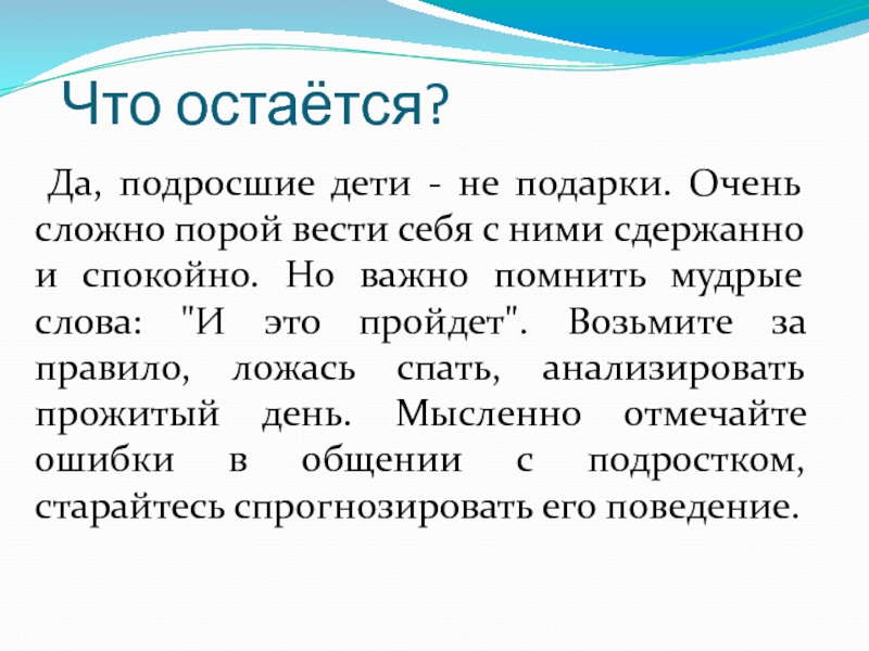 порой вести себя с ними сдержанно и спокойно. Но важно помнить мудрые слова: "И это пройдет". Возьмите за правило, ложась спать, анализировать прожитый день. Мысленно отмечайте ошибки в общении с подростком, старайтесь спрогнозировать его поведение.