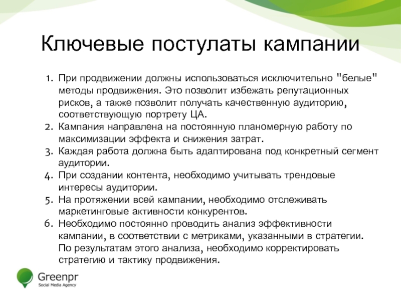 Необходимо постоянно проводить анализ эффективности кампании, в соответствии с метриками, указанными в стратегии. По результатам этого анализа, необходимо корректировать стратегию и тактику продвижения.