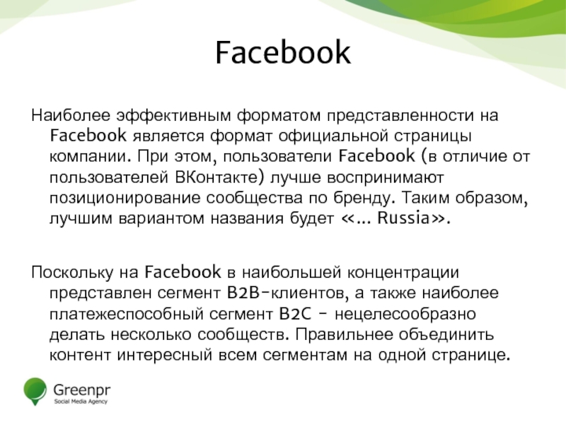 При этом, пользователи Facebook (в отличие от пользователей ВКонтакте) лучше воспринимают позиционирование сообщества по бренду. Таким образом, лучшим вариантом названия будет «... Russia».