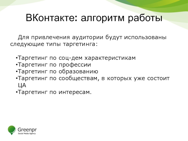 Для привлечения аудитории будут использованы следующие типы таргетинга: