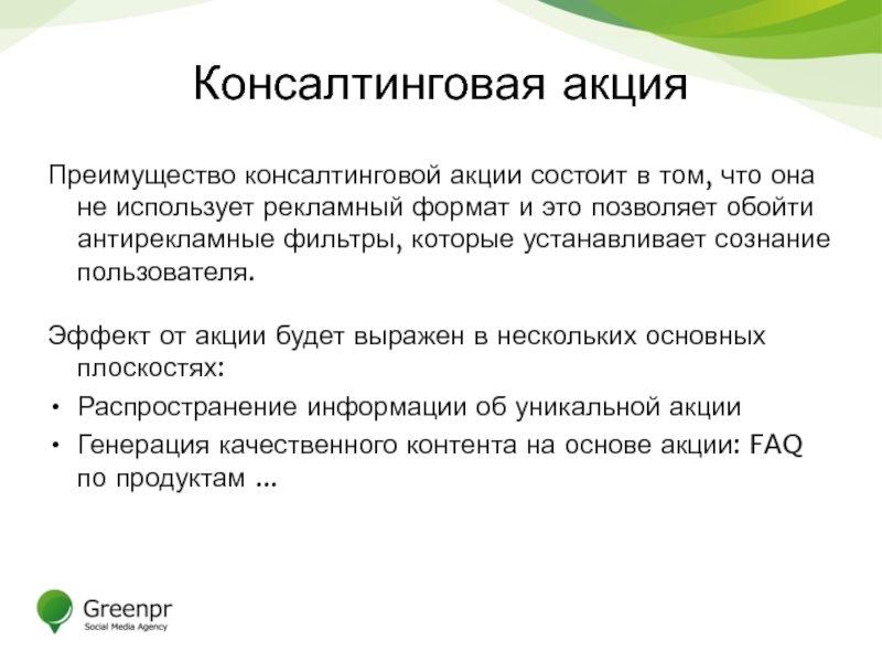 Преимущество консалтинговой акции состоит в том, что она не использует
