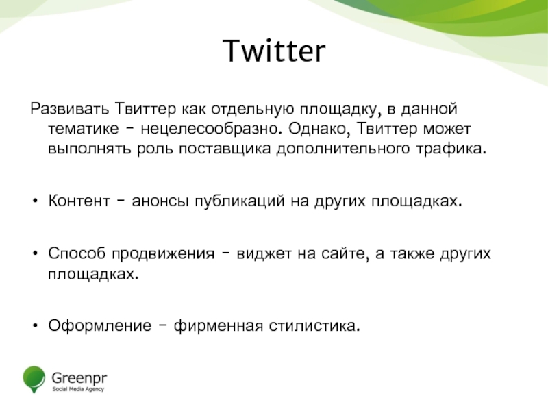 Развивать Твиттер как отдельную площадку, в данной тематике - нецелесообразно. Однако,