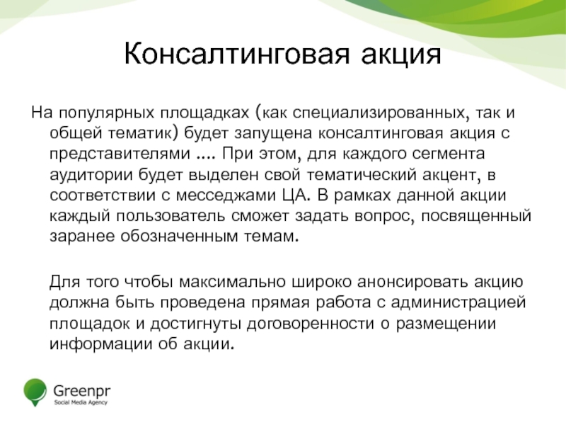 запущена консалтинговая акция с представителями .... При этом, для каждого сегмента аудитории будет выделен свой тематический акцент, в соответствии с месседжами ЦА. В рамках данной акции каждый пользователь сможет задать вопрос, посвященный заранее обозначенным темам.