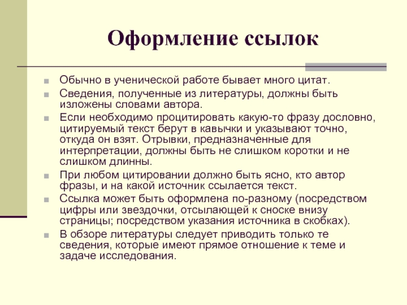 Если необходимо процитировать какую-то фразу дословно, цитируемый текст берут в кавычки и указывают точно, откуда он взят. Отрывки, предназначенные для интерпретации, должны быть не слишком коротки и не слишком длинны.