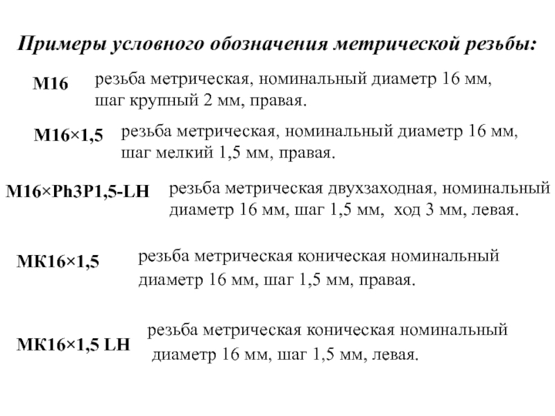 Слайд 17Примеры условного обозначения метрической резьбы: