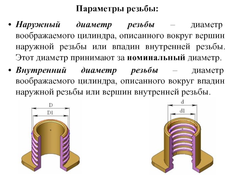 Наружный диаметр резьбы – диаметр воображаемого цилиндра, описанного вокруг вершин