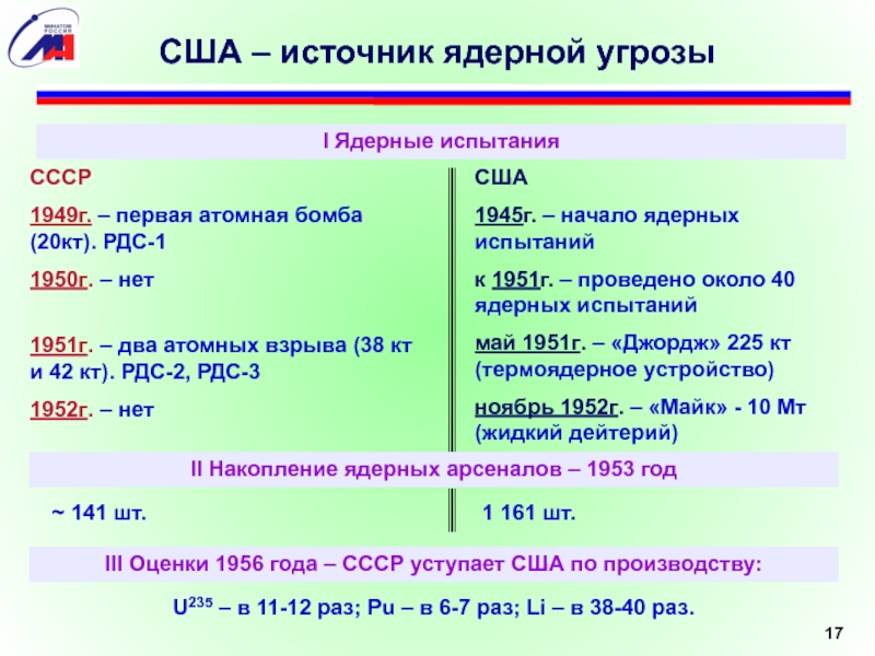 к 1951г. – проведено около 40 ядерных испытаний