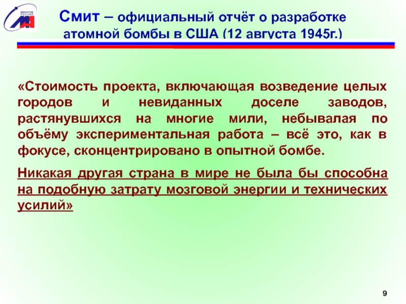 «Стоимость проекта, включающая возведение целых городов и невиданных доселе заводов, растянувшихся на многие мили, небывалая по объёму экспериментальная работа – всё это, как в фокусе, сконцентрировано в опытной бомбе.