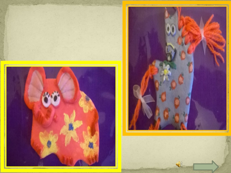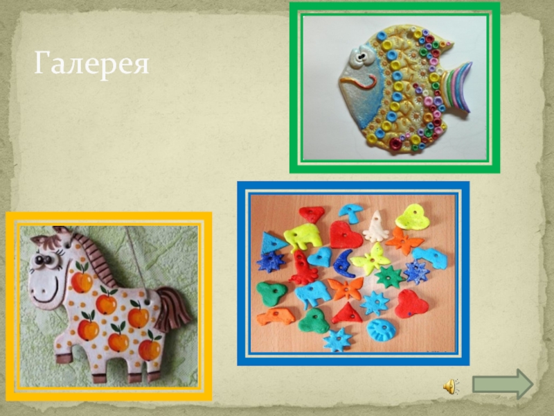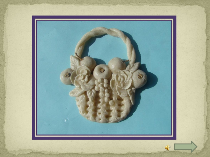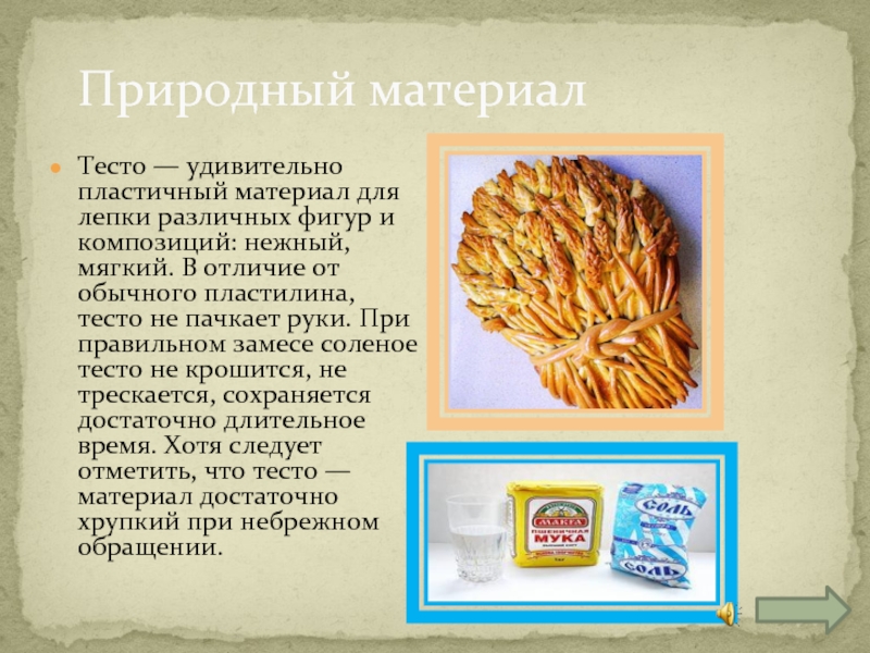 и композиций: нежный, мягкий. В отличие от обычного пластилина, тесто не пачкает руки. При правильном замесе соленое тесто не крошится, не трескается, сохраняется достаточно длительное время. Хотя следует отметить, что тесто — материал достаточно хрупкий при небрежном обращении.
