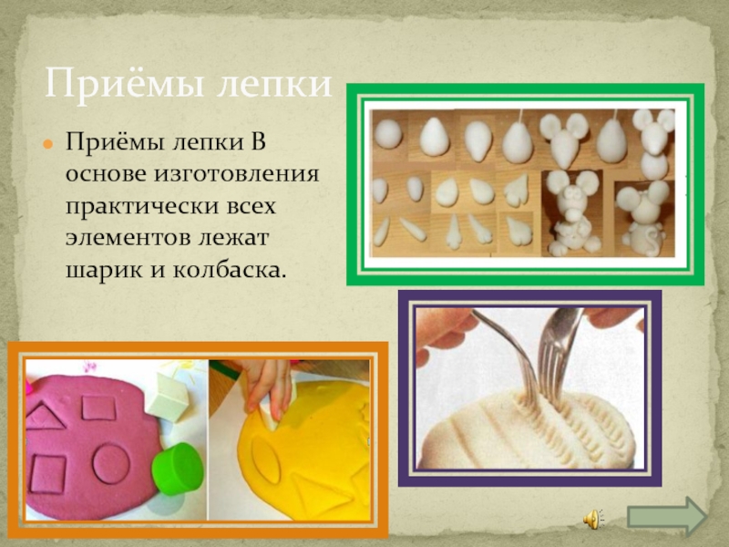 Приёмы лепки В основе изготовления практически всех элементов лежат шарик