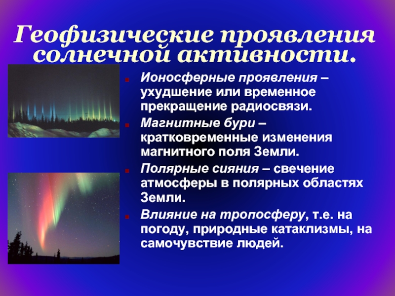 Солнечная активность имеет 11-летнюю цикличность. В годы солнечной активности на Солнце много активных образований, в годы минимума – центров активности мало.