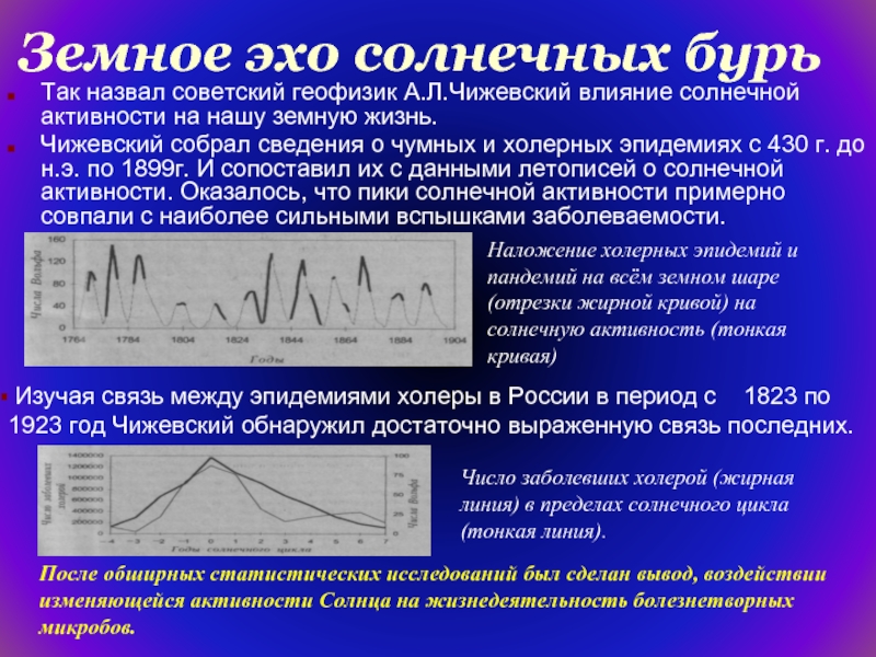Изучая связь между эпидемиями холеры в России в период с  1823 по   1923 год Чижевский обнаружил достаточно выраженную связь последних.