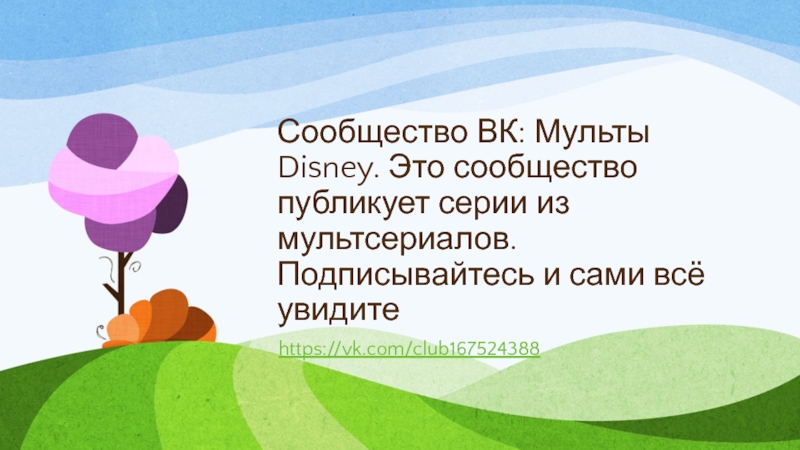 Слайд 8Сообщество ВК: Мульты Disney. Это сообщество публикует серии из мультсериалов. Подписывайтесь