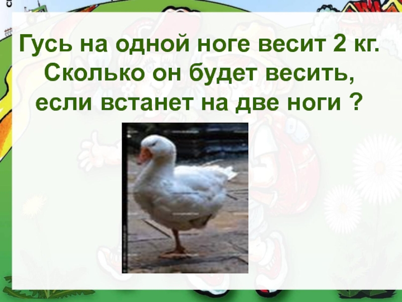 Слайд 19Гусь на одной ноге весит 2 кг. Сколько он будет весить, если