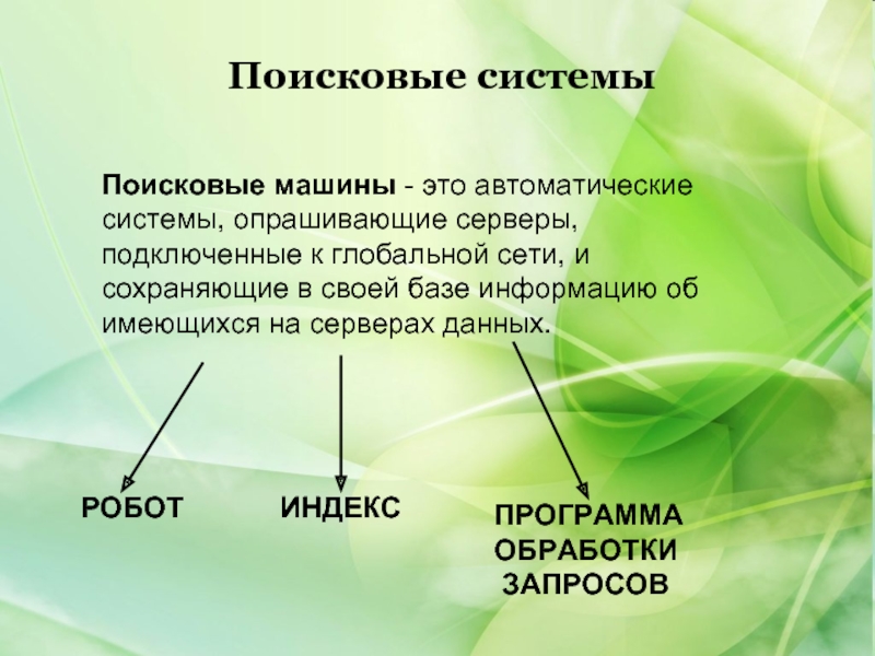 Поисковые машины - это автоматические системы, опрашивающие серверы, подключенные к глобальной сети, и сохраняющие в своей базе информацию об