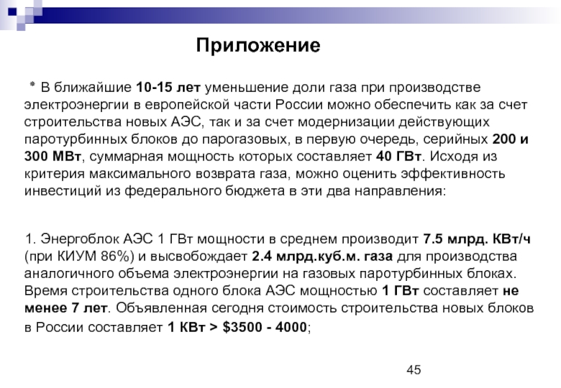 1. Энергоблок АЭС 1 ГВт мощности в среднем производит 7.5 млрд. КВт/ч (при КИУМ 86%) и высвобождает 2.4 млрд.куб.м. газа для производства аналогичного объема электроэнергии на газовых паротурбинных блоках. Время строительства одного блока АЭС мощностью 1 ГВт составляет не менее 7 лет. Объявленная сегодня стоимость строительства новых блоков в России составляет 1 КВт > $3500 - 4000;
