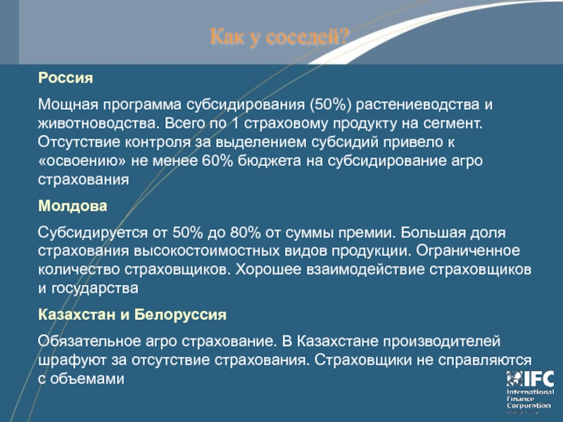 Субсидируется от 50% до 80% от суммы премии. Большая доля страхования высокостоимостных видов продукции. Ограниченное количество страховщиков. Хорошее взаимодействие страховщиков и государства