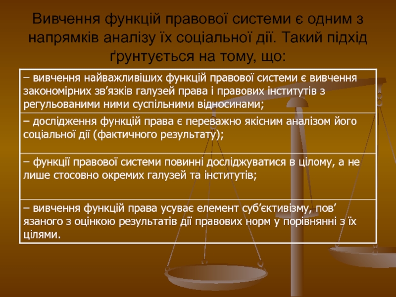 Слайд 16Вивчення функцій правової системи є одним з напрямків аналізу їх соціальної