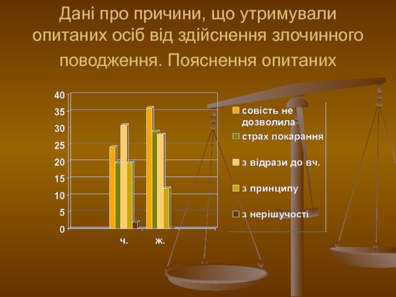 Слайд 18Дані про причини, що утримували опитаних осіб від здійснення злочинного поводження.
