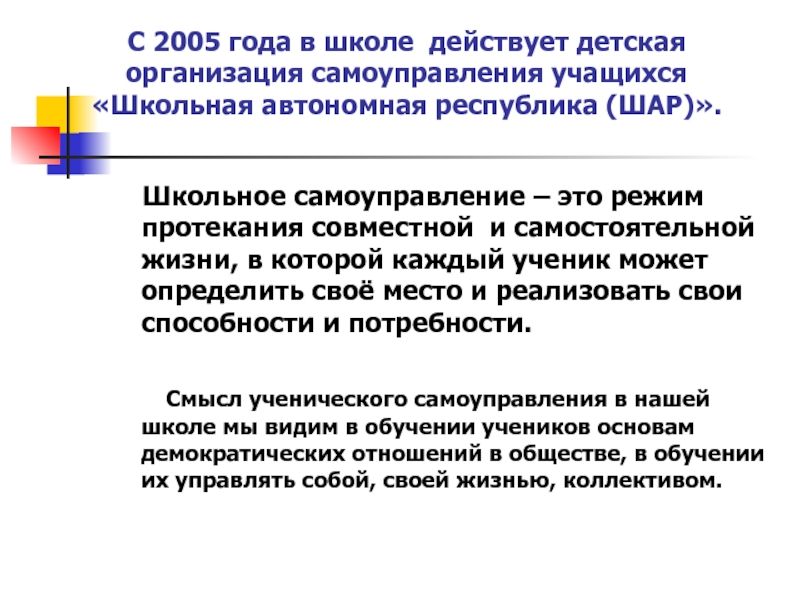 Школьное самоуправление – это режим протекания совместной и самостоятельной жизни, в которой каждый ученик может определить своё место и реализовать свои способности и потребности.