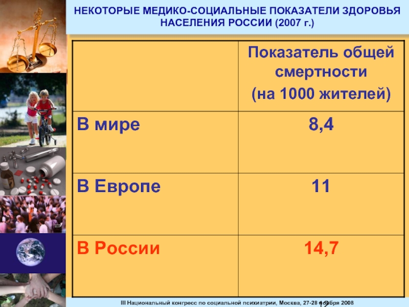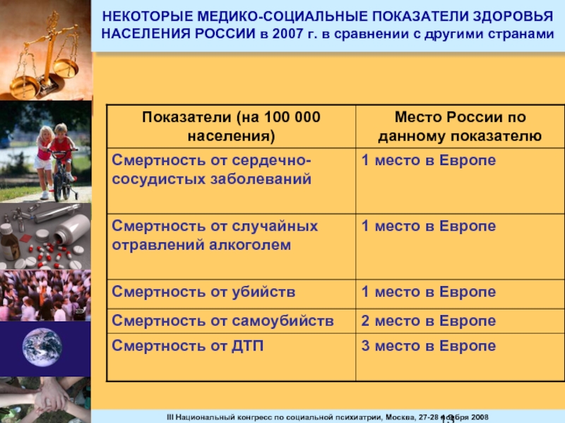 Слайд 13НЕКОТОРЫЕ МЕДИКО-СОЦИАЛЬНЫЕ ПОКАЗАТЕЛИ ЗДОРОВЬЯ
