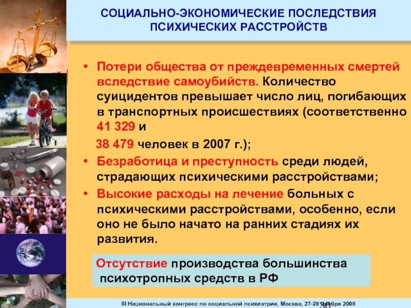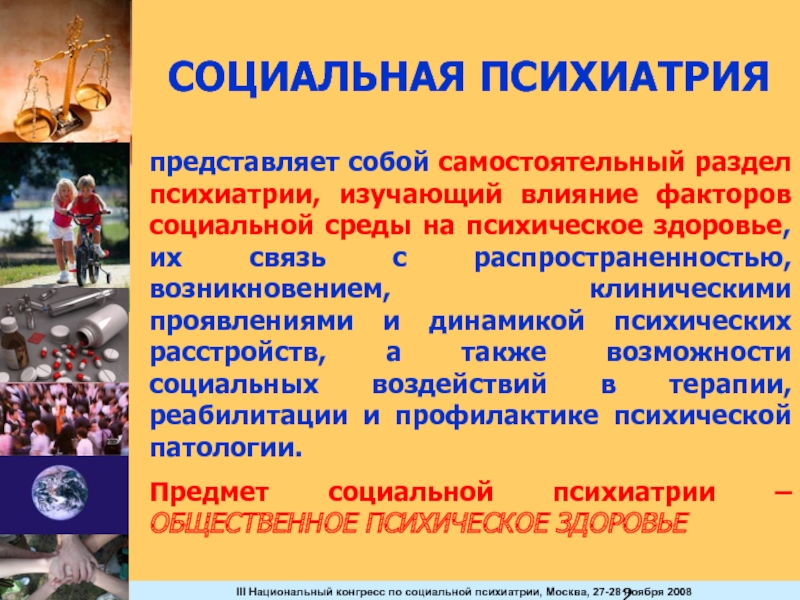 на психическое здоровье, их связь с распространенностью, возникновением, клиническими проявлениями и динамикой психических расстройств, а также возможности социальных воздействий в терапии, реабилитации и профилактике психической патологии.