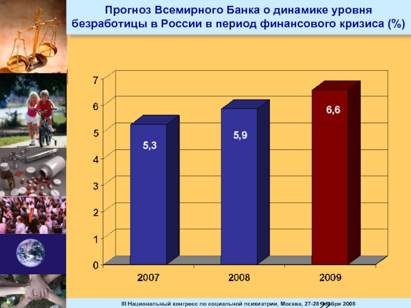 Слайд 22Прогноз Всемирного Банка о динамике уровня безработицы в России в период