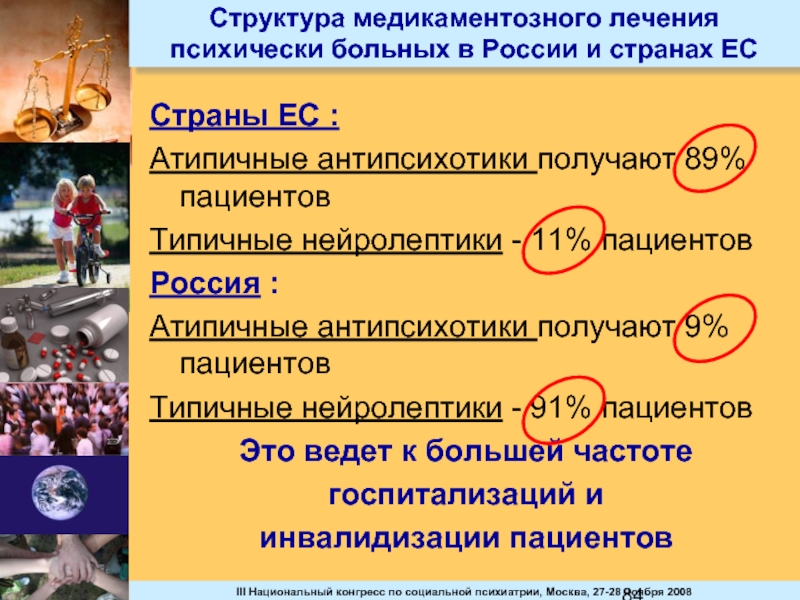 Слайд 84Структура медикаментозного лечения психически больных в России и странах ЕС