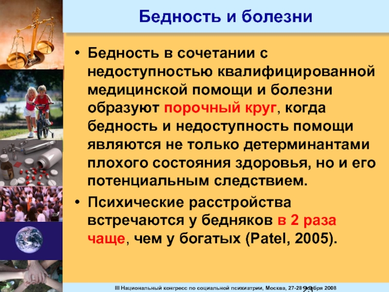 болезни образуют порочный круг, когда бедность и недоступность помощи являются не только детерминантами плохого состояния здоровья, но и его потенциальным следствием.