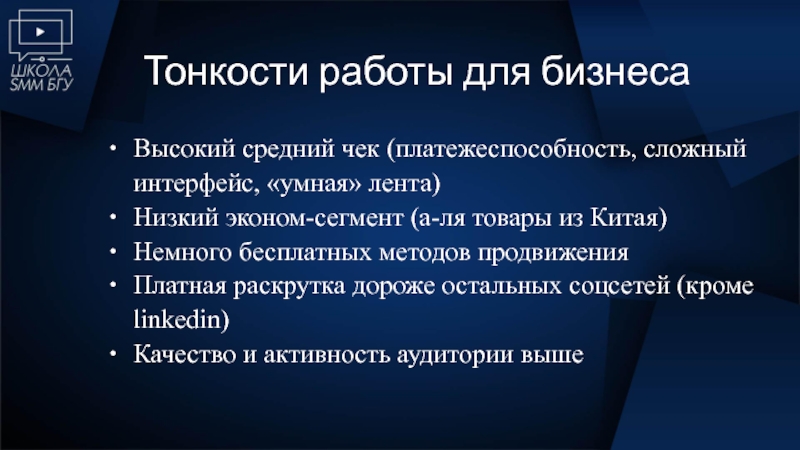 Высокий средний чек (платежеспособность, сложный интерфейс, «умная» лента)