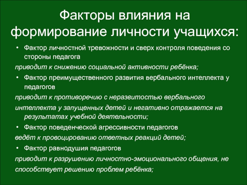 Слайд 6Факторы влияния на формирование личности учащихся: